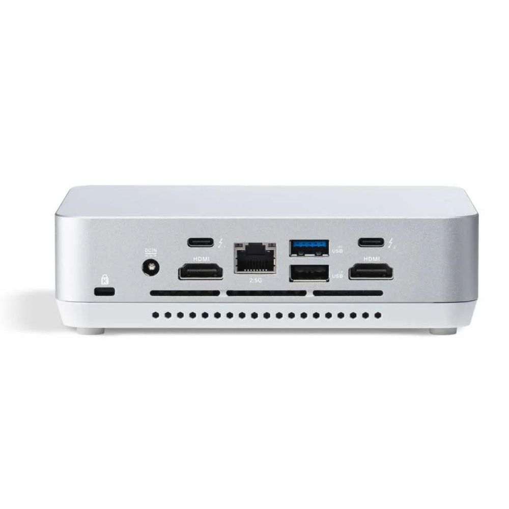 It is typically deployed in office environments, kiosks, control systems, and edge nodes where space constraints prevent traditional tower desktops. The compact 5×4-inch chassis allows mounting behind monitors or inside tight enclosures while still providing multi-display output via HDMI and Thunderbolt 4.