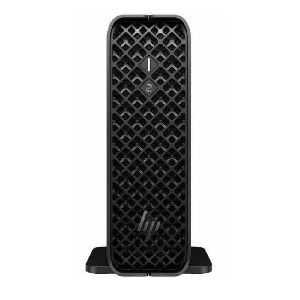 The mini form factor (approx. 2.72″ × 8.31″ × 8.58″) fits under monitors or into compact IT closets, making it suitable for design desks, visualization stations, and space‑constrained work areas. Power is delivered via an external adapter up to ~280 W, compatible with standard office electrical infrastructures.