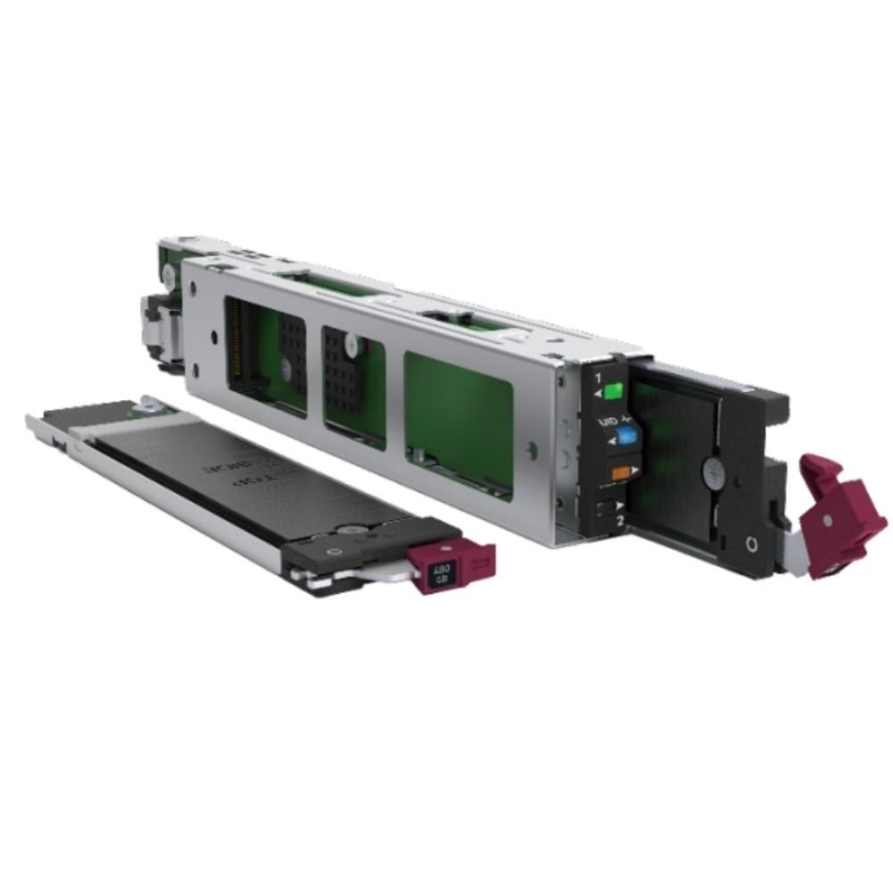This module includes two enterprise‑class 480 GB NVMe M.2 SSDs mirrored in hardware RAID‑1, enabling predictable boot availability and redundancy against single drive failure.