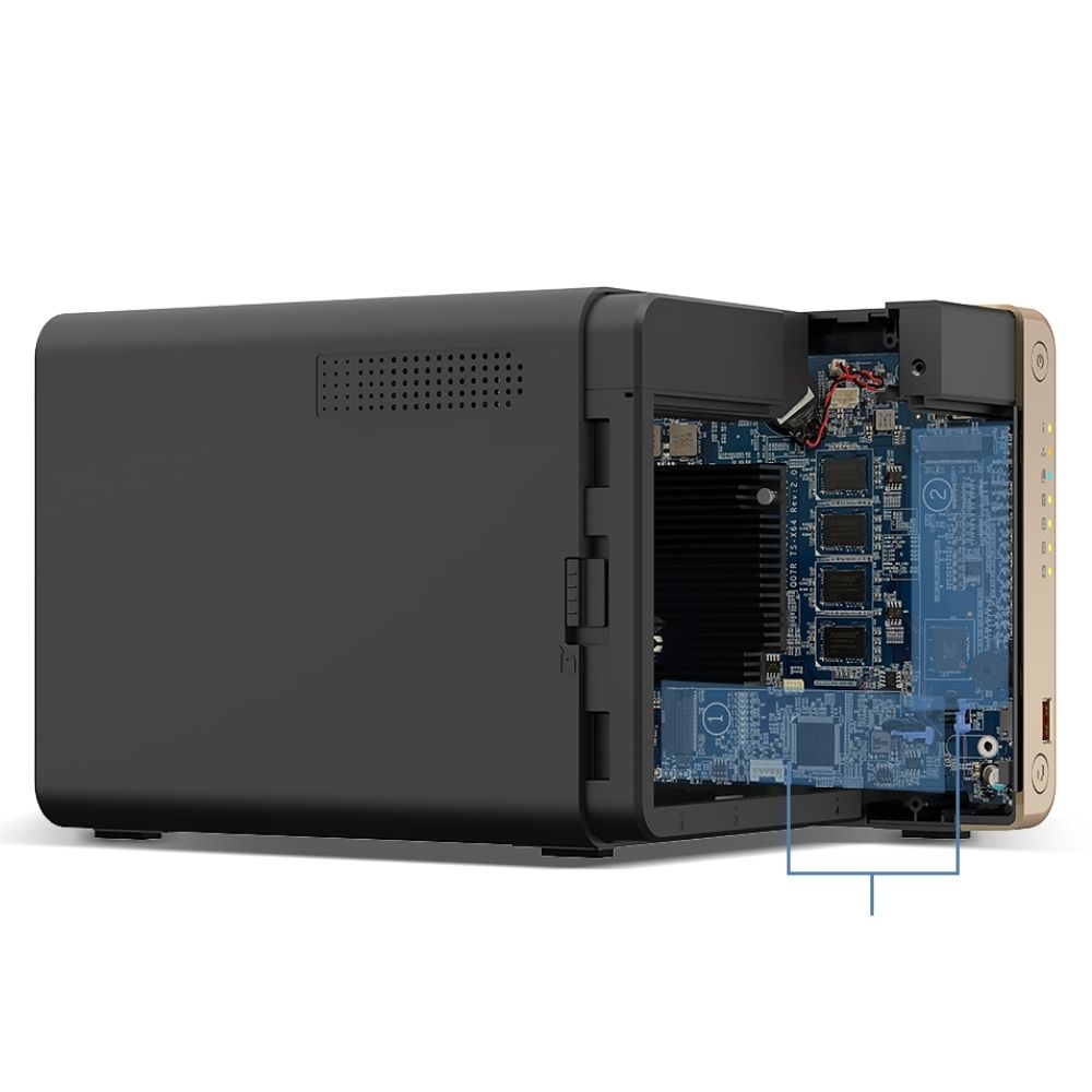 This model includes four 3.5″/2.5″ SATA III drive bays with flexible RAID support, and dual 2.5 GbE network ports that can be aggregated for higher throughput. Dual M.2 PCIe Gen 3 slots allow SSD caching or storage pools to enhance performance. Expansion is possible via a PCIe Gen 3 x2 slot for network upgrades such as 10 GbE.