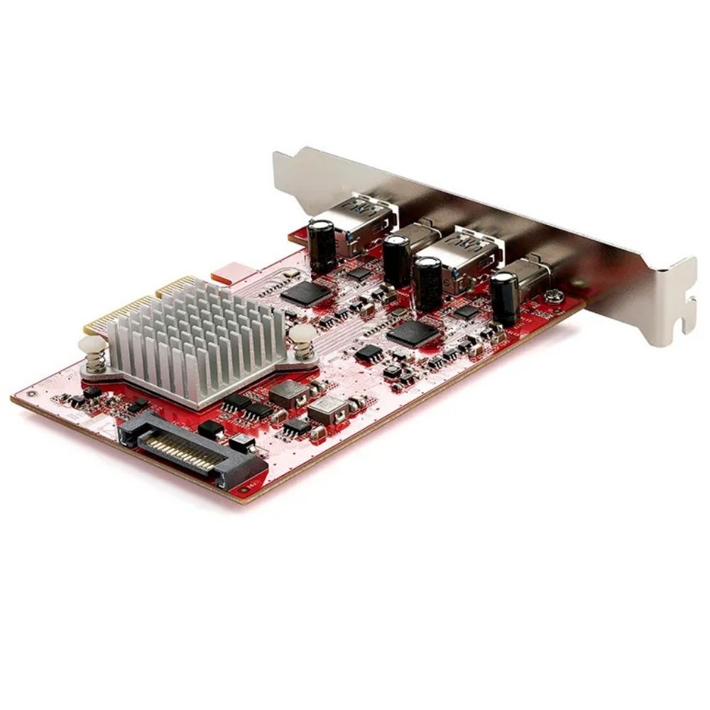 This adapter leverages a PCIe 3.0 x4 host interface to deliver combined bandwidth of up to 20 Gbps across its four USB ports, with two USB‑C and two USB‑A connectors. Controller logic (dual ASM3142 controllers) balances throughput among attached devices. Optional SATA power input can supplement port power delivery when the PCIe slot’s power budget is insufficient.