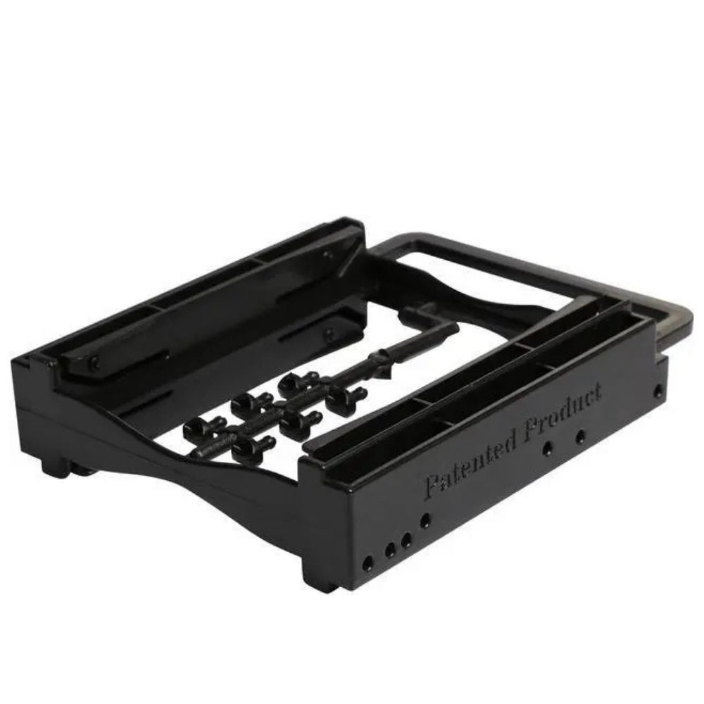 The bracket accommodates a pair of 2.5″ storage devices with heights from 5 mm to 12.5 mm and secures them into the adapter using a tool‑less installation design with pegs. Once populated, the assembled unit fits into a standard 3.5″ bay and holds the drives securely, enabling desktops and workstations to utilize high‑performance 2.5″ SSDs or HDDs where only larger bays are available.